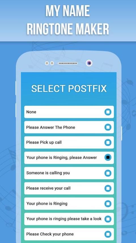 Dalam My Name Ringtone Maker aplikasi Anda dapat mengatur nada dering kustom Anda seperti nama Anda, beberapa awalan dan banyak lagi. Tidak hanya nama Anda sendiri. Anda dapat membuat ringtone menggunakan nama apapun. Bagaimana terkenal nama bisa, Anda bisa menjadikannya sebagai panggilan ringtone masuk Anda.