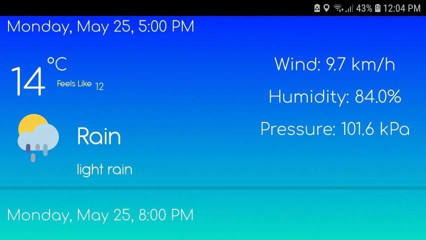 ○ Prakiraan Lima Hari / 3 Jam: Dapat mengambil data prakiraan untuk kota mana saja di seluruh dunia dengan waktu yang ditampilkan di zona waktu yang benar. Prakiraan cuaca akan memberikan data cuaca untuk setiap tiga jam hingga lima hari dengan semua informasi terperinci yang disediakan dalam cuaca saat ini.