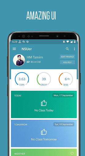 menunjukkan beberapa kartu penting seperti kelas mana yang hari ini dan besok, dan cuaca saat ini dan perkiraan 3 hari.