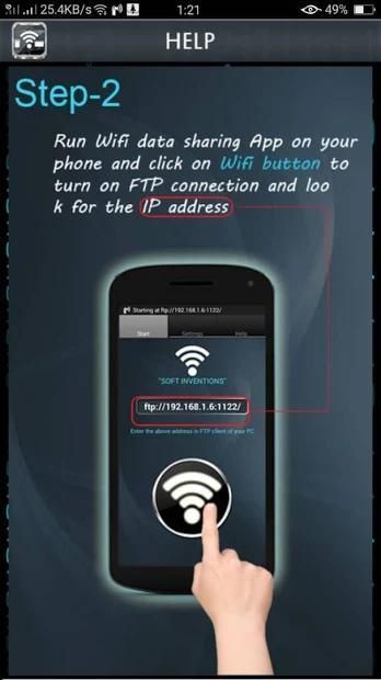 Open the app, turn on WiFi and tap WiFi icon to get the IP Address