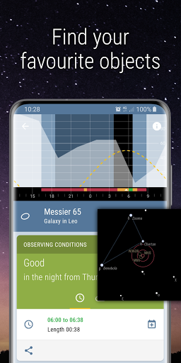 Nightshift hadir dikemas dengan basis data besar objek langit dalam, termasuk katalog Messier, Caldwell, NGC dan IC lengkap. Diagram kegelapan dan langit yang jelas menunjukkan ketika kondisinya menguntungkan untuk mengamati galaksi favorit Anda, cluster globular, nebula dan keajaiban lain dari ruang yang dalam.