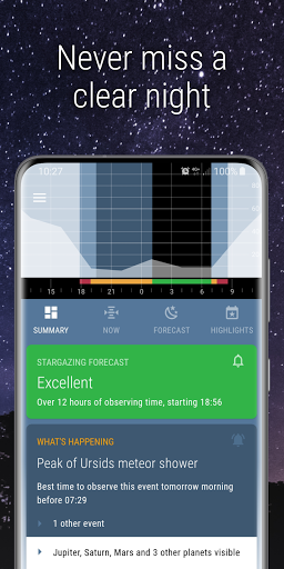 Lihat Darkness dan Cloud Cover Prakiraan untuk lokasi apa pun di dunia dan temukan peluang mengamati terbaik malam ini. Diagram senja menunjukkan Anda kegelapan, cuaca dan mengamati kondisi untuk setiap malam sekilas. Menerima pemberitahuan ketika kondisinya baik untuk lokasi pengamatan favorit Anda.
