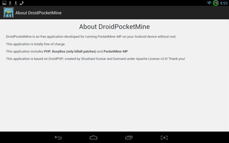 This application is based on DroidPHP, made by Sushant Kumar, and licensed under Apache License v2.0! Thank you for making it open source! At this moment, it shares with it only a part of the whole code, but without some fragments from his code, it would be much harder! It also uses PHP (v5.4.15, precompiled by shoghicp, thank you!), PocketMine (v1.3.6 Alpha) and killall executable from BusyBox!