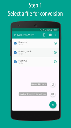 Ubah file Microsoft Publisher (.pub) Anda ke dalam dokumen Word yang dapat diedit tepat di perangkat Android Anda atau Chromebook. Ideal untuk saat Anda menerima publikasi dalam format .pub dan tidak dapat membukanya. Mudah dan cepat mengkonversi file penerbit dari mana saja di perangkat Anda, Dropbox, Google Drive, Box dan OneDrive.