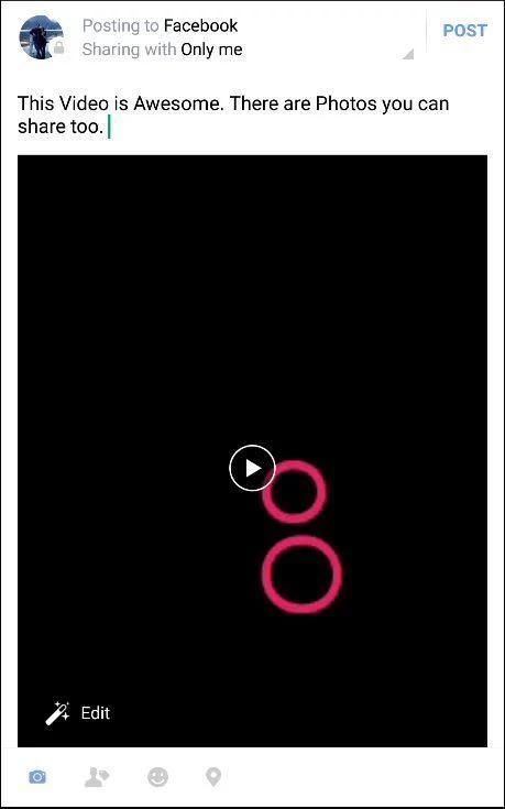 - Berbagi Konten: Bagi link URL ke timeline Anda. Anda juga dapat berbagi foto atau video yang ada di camera roll Anda, atau mengambil foto / video baru dan berbagi ke timeline Facebook Anda (catatan: untuk berbagi foto atau video yang harus memiliki aplikasi Facebook asli diinstal pada telepon Anda).