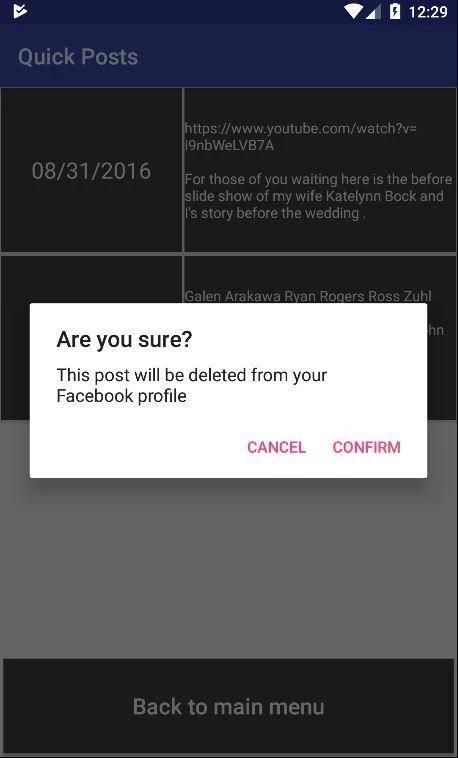 Facebook Cepat Posts digunakan untuk mengedit dan menghapus pesan posting dari akun facebook Anda saat ini. Hal ini juga dapat digunakan sebagai cara cepat untuk berbagi foto, video, atau URL ke akun Anda. Ini adalah aplikasi sederhana kecil yang cepat dan mudah digunakan.