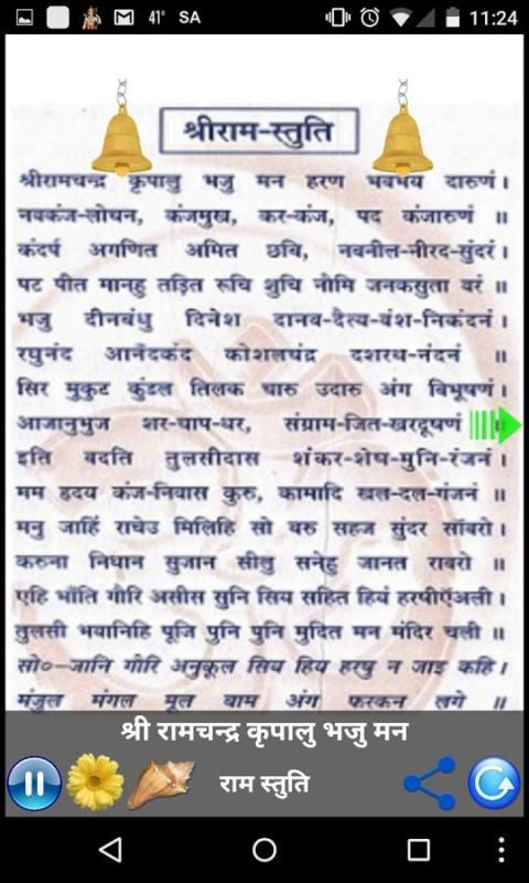 Aplikasi ini berisi menenangkan RAM STUTI sebagai doa dan meditasi. Ini membantu untuk memberitahu pikiran kita sebagai .. O pikiran! Revere yang Shree Ramachandra jinak, yang menghilangkan 'Bhav' yang Kesedihan atau sakit, 'Bhaya' rasa takut, dan 'Darun' kelangkaan atau kemiskinan. Aplikasi ini berisi musik lembut dan sooting dan banyak mengambang gambar yang menarik.