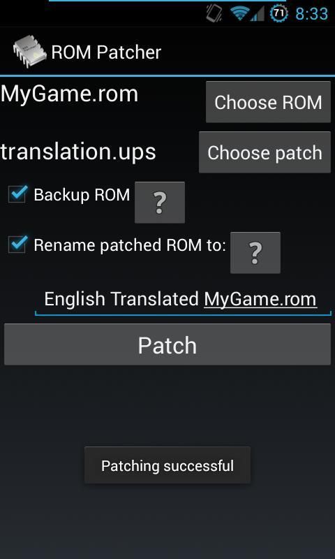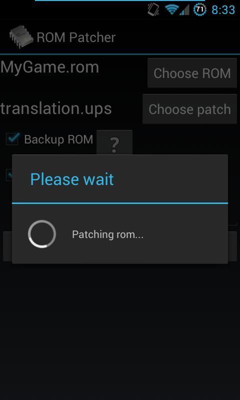 ROM Patcher adalah ROM / file biner patcher yang mendukung banyak format Patch, serta dekompresi file ECM melalui unecm. Cukup memilih file untuk patch, patch itu sendiri, dan secara opsional nama file output dan tekan "patch". Terapkan terjemahan untuk ROM Anda sendiri / ISO (bukan asli game Android). Tidak ada ROM, ISO atau patch yang disertakan. Semua permintaan untuk ROM dan ISO akan diabaikan.