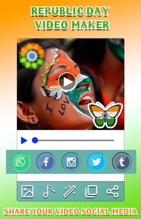 Buat Menarik mencari republik hari video dengan menyesuaikan video Anda. Apakah Anda ingin gambar Anda akan muncul dalam video Hari Republik yang indah? video fantasi ini sangat ideal bagi Anda untuk video Anda kenangan dan membuat mereka tak terlupakan. Menggunakan aplikasi ini Anda dapat membuat video lebih indah dengan dekorasi mereka dengan fantastis gratis Hari Republik video yang pembuat, efek, teks dan stiker.