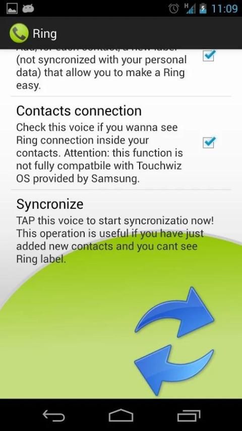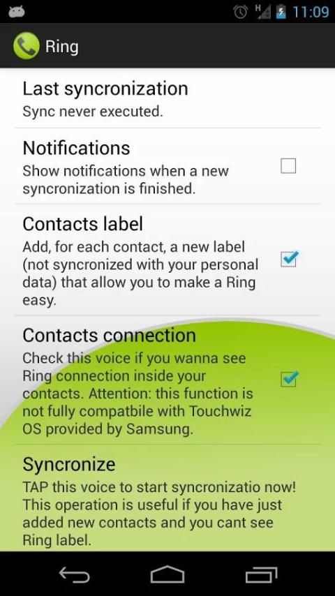 Ketika Anda menginstal dan mengaktifkan Ring untuk pertama kalinya, aplikasi mengakses daftar kontak Anda, terlihat untuk semua kontak kepada siapa satu atau beberapa nomor telepon yang morized dan secara otomatis menambah daftar pilihan di mana Anda dapat dengan cepat membuat sebuah cincin ke teman Anda. Ini benar-benar tidak menggunakan kontak Anda untuk lingkup lain dan sebagai jaminan ini, tidak memerlukan akses ke web.