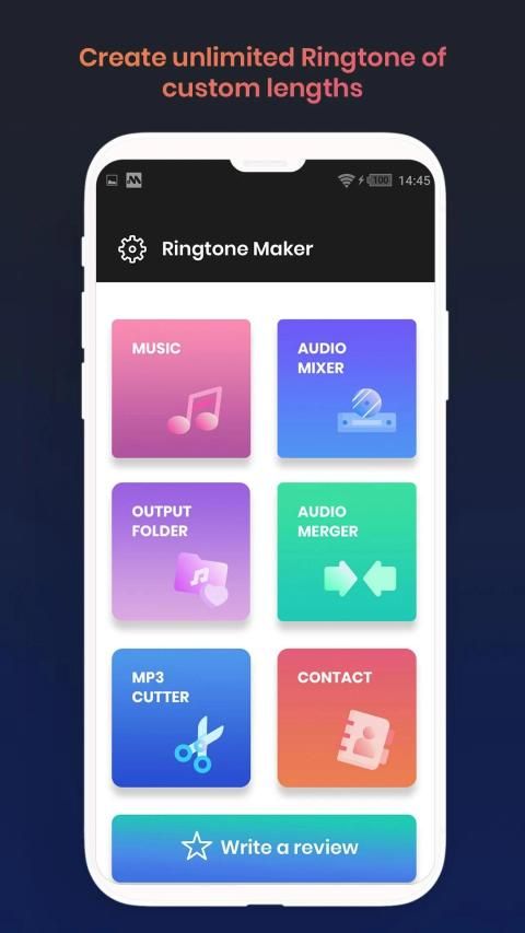 Cutter Pemotong MP3: Pilih bagian terbaik dari Lagu, kemudian rapikan dan potong bagian yang diinginkan dari lagu tersebut untuk digunakan dalam Nada Dering, Nada pemberitahuan, Nada alarm. Inbuilt player untuk pemilihan lokasi awal pemotong nada dering, lokasi ujung potong dan dukungan gelombang. Pemotong Mp3 mendukung pemotongan MP3, AAC, WAV, M4A, AMR dll.