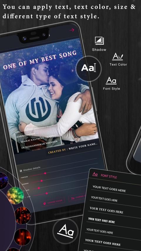 adalah aplikasi yang memungkinkan pengguna menambahkan lirik dengan lagu favorit Anda. aplikasi ini memiliki konsep sesuatu yang baru Anda dapat membuat video liris foto indah Anda sendiri. memiliki pilihan untuk memilih lebih banyak gambar dengan bantuan galeri dan memiliki semua gambar memiliki opsi untuk mengaturnya dengan gaya yang berbeda.