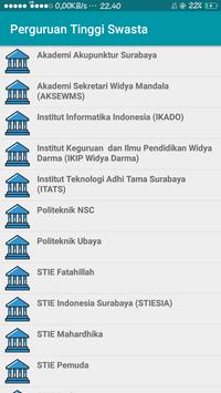 Aplikasi ini digunakan untuk memudahkan masyarakat dalam hal pencarian lokasi Perguruan Tinggi Swasta (PTS) di Surabaya yang didalamnya terdapat informasi. Untuk mengetahui akreditasi institusi dan akreditasi jurusan, sistem ini akan menghubungkan langsung dengan website BAN-PT.