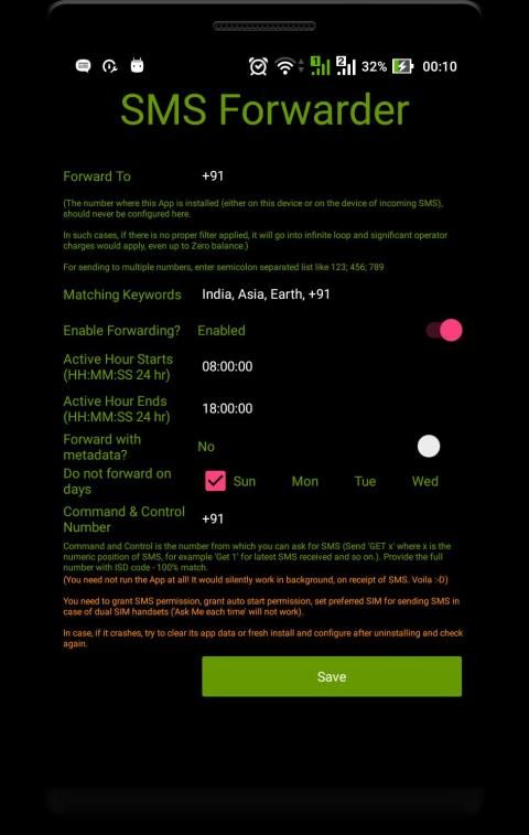 Nomor di mana Aplikasi ini diinstal (baik di perangkat ini atau di perangkat SMS yang masuk), tidak boleh dikonfigurasikan di sini. Dalam kasus seperti itu, jika tidak ada filter yang tepat diterapkan, itu akan masuk ke loop tak terbatas dan biaya operator yang signifikan akan berlaku, bahkan hingga saldo Nol.