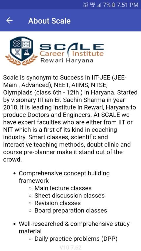 Scale Career Institute Dimulai oleh visioner IITian Er. Sachin Sharma pada tahun 2018. Ini adalah lembaga terkemuka di Rewari, Haryana untuk menghasilkan Dokter dan Insinyur. Di SCALE kami memiliki fakultas ahli yang berasal dari IIT atau NIT yang merupakan yang pertama dari jenisnya dalam industri pelatihan.