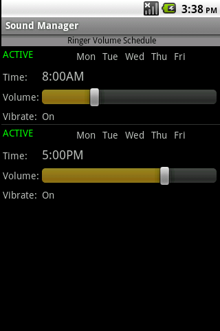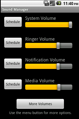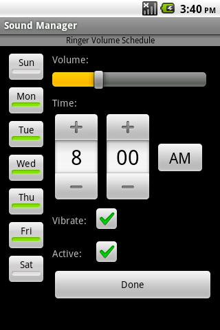 Sound Manager is the first and best app for controlling the volumes on your Android device, automatically, any time you39;d like.Sound Manager exposes Android39;s sound amp; volume controls. It provides a quick way to change Ring Mode or Vibration settings, or mute and unmute your phone. You can also add shortcuts to these settings on your home screen.For each volume setting you can also schedule the volume to change at any time on any day of the week. For example, you might want your Notifications to be silent at night but keep your Ringer volume up in case you get an important call. Or you want to turn your phone down during a meeting or a work day, but not worry that you39;ll forget to turn it back up after. You can schedule these volume changes whenever you39;d like. Great for anybody, but especially for those driven by a schedule.See inapp tutorial for instructions and F.A.Q., if needed.