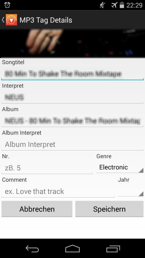 Anda dapat menemukan Editor Tag MP3 (beta) melalui menu. Ubah Album, Artis, Judul, Genre, dan Lacak Jumlah lagu yang Anda unduh. Daftar genre terdiri dari 80 ID3v1-Genre resmi pertama dari tahun 1999. Anda juga dapat Mainkan, Bagikan, dan Hapus jejak dari sana.