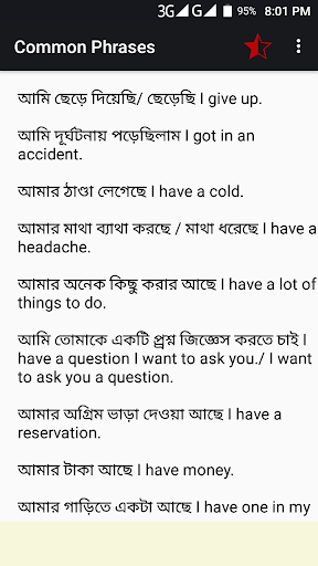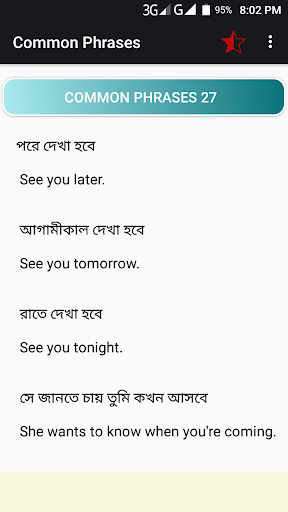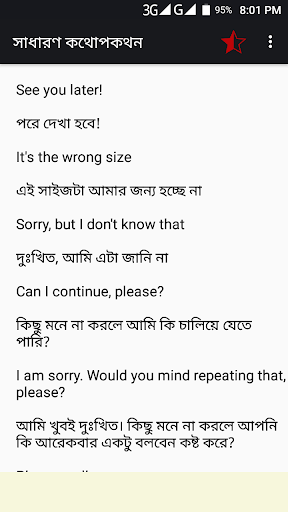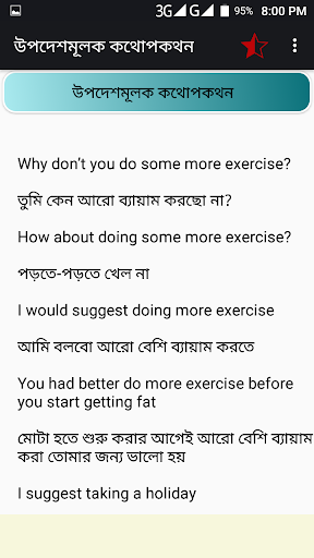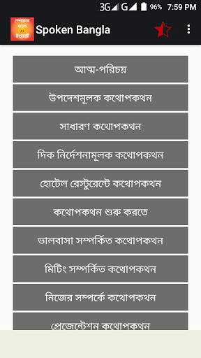 You click on sentence for pronounce or listening. This app help Bengali English Conversation. It works as a Bangla to English Speaking tutorial for fluent English speaking.