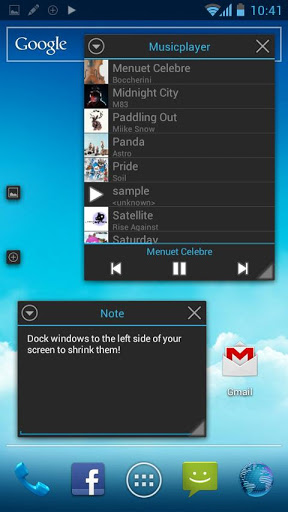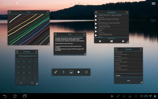 Tiny Apps is a package of 5 useful floating apps that stay on top of all other apps. You can run several windows of the same Tiny App.This is the lite-version of Tiny Apps. It has a limited amount of features (available in Tiny Apps Pro: dock windows to the left side of your screen, change the window's transparency)Tiny Notes- save notes to your storage- open saved notes- share text right out of Tiny Notes- copy and paste supportedTiny Recorder*- start a recording and save it to your storage- delete and share recordingsTiny paint - trace something on your screen- open and save paintings- select one of 36 colors- undo possibility- clear canvasTiny Musicplayer*- lists all musicfiles on your device- displays artist, title and albumcover- play/pause, next, previous- select random sequence- enable repeatmodeTiny calculator - calculate simple and complex arithmetical problems- switch between basic and advanced numberpad- copy the result to your clipboardTiny Apps includes a widget for your homescreen. You can open a Tiny App with less clicks.FAQ - frequently asked questions:How do i open a window's menu?- Tap a window's left top icon to open a menu.How do i move windows?- Tap a window's titlebar and drag the window around.How do i resize windows?- Tap a window's right bottom corner and drag it to resize a window.Fell free to contact the developer: cadr.market@gmail com*This app doesn't support multiple instances.