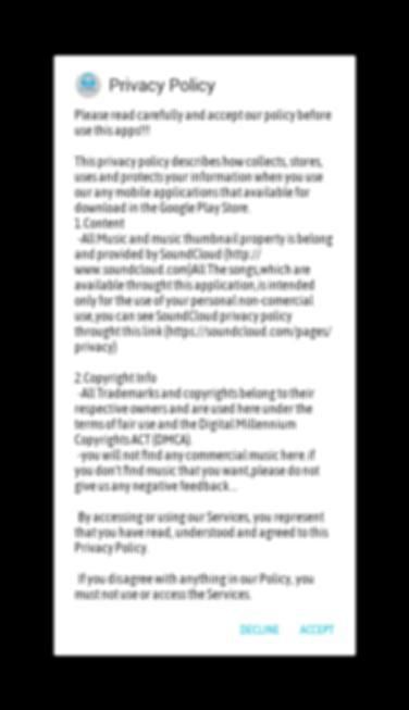 -Semua Musik dan properti thumbnail musik adalah milik dan disediakan oleh SoundCloud (http://www.soundcloud.com) Semua Lagu, yang tersedia melalui aplikasi ini, dimaksudkan hanya untuk penggunaan penggunaan nonkomersial pribadi Anda, Anda dapat melihat kebijakan privasi SoundCloud melalui tautan ini (https://soundcloud.com/pages/privacy) ...