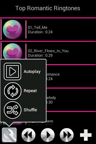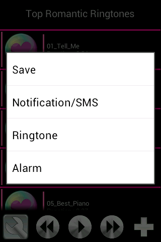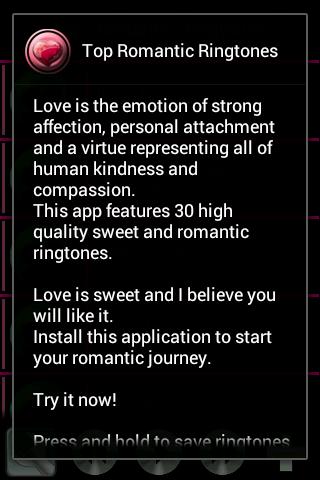 Love is the emotion of strong affection, personal attachment and a virtue representing all of human kindness and compassion.This app features 30 high quality sweet and romantic ringtones Love is sweet and I believe you will like it. Install this application to start your romantic journey.Try it nowPress and hold to save ringtones or set as ringtone, notification or alarm.Saved ringtones can be found in sdmusicRomanticRingtonesfolder.Tags: romantic ringtones, love ringtones, romantic, romance theme popular ringtones, top ringtones, hot ringtones, sweet ringtones, best ringtonesWe do not own these song, they belongs to their rightful owners.No copyright infringement intended.TAKE NOTE:This app will add a few search access points on your device. If you do not want to use this new search page and notification you can either ignore it or delete it. Notification can be turned off in menu and optout in http:www.airpush.comoptout. If you do use it, we get a few cents and it will help us a lot to keep developing more apps. If you dont, you can delete it and no harm is done. our app remains the same, no need to uninstall it. Thank you.
