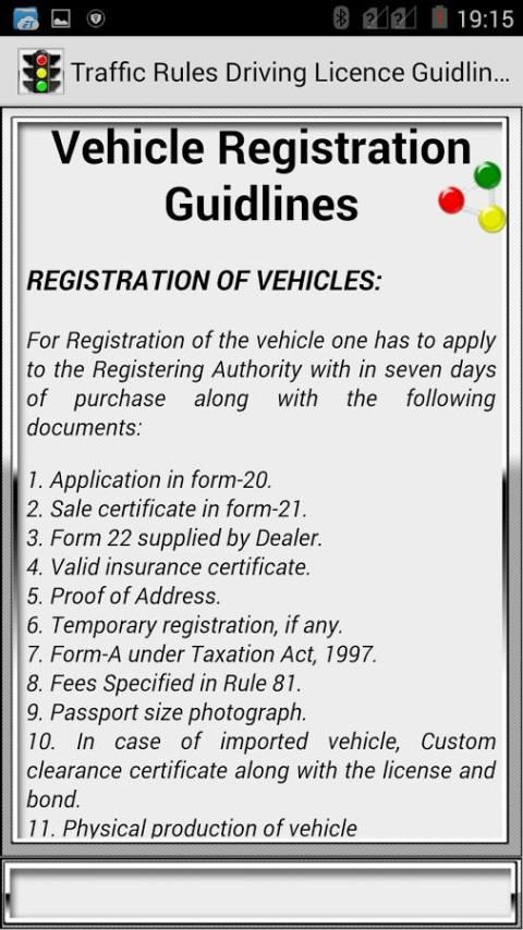 Aplikasi Informasi ini lengkap tentang RTO, Trafic, Lisensi, Pendaftaran Mengemudi, Dan termasuk Lalu Lintas Aturan & Tanda informasi. Mengemudi Proses Lisensi, Pedoman dan sampel test.Information Tentang kendaraan pipis batas, aturan dasar, lalu lintas aturan pertanyaan.