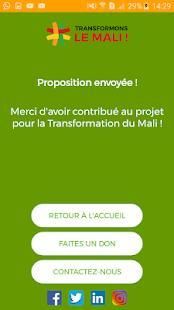 Melalui lima tuas kunci - Platform demokrasi partisipatif www.transformonslemali.org inkubator warga pengolahan kafilah, komisi ahli dan dasar untuk perubahan, ambisi kami adalah untuk mencapai sebuah proyek untuk transformasi Mali, yang akan menjadi alat untuk mempengaruhi tindakan pembuat kebijakan.