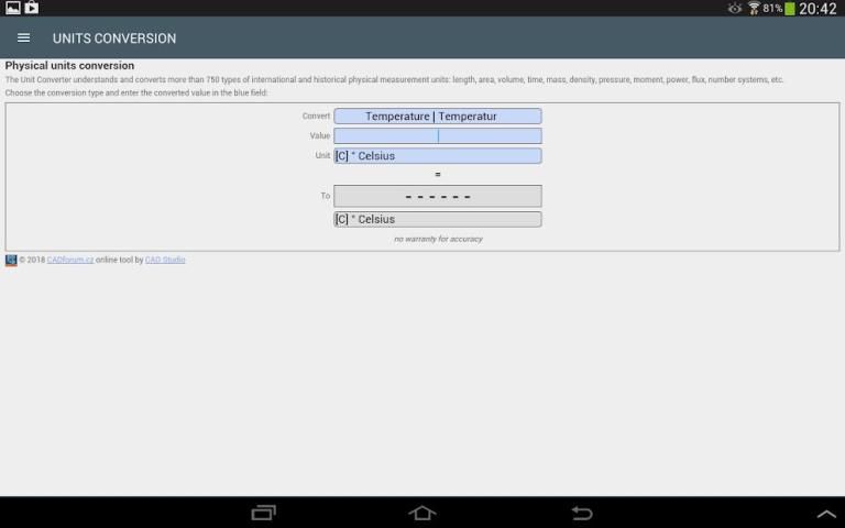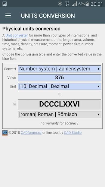 Mengubah ratusan unit pengukuran fisik internasional dan historis, tidak hanya dari area CAD - panjang, luas, volume, waktu, massa, kepadatan, kecepatan, tekanan, gaya, momen, daya, energi, fluks, sistem angka, sudut, frekuensi, akselerasi, suhu, intensitas cahaya, muatan listrik, sistem numerik, dll.