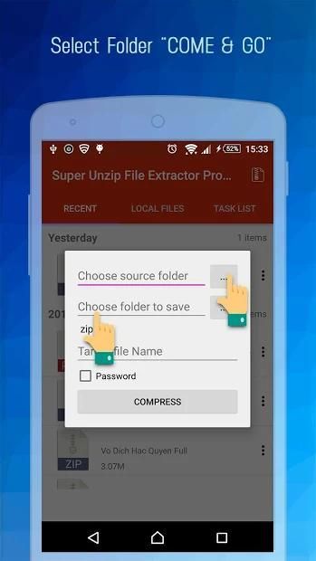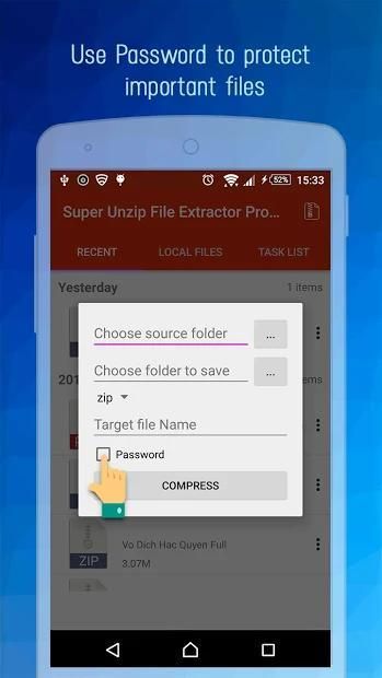 Super Unzip file Extractor membantu Anda dengan cepat kompres folder sebagai Rar dan ZIP lagi dan Anda dapat dengan mudah mengatur sandi untuk melindungi file Anda. Aplikasi ini dapat mengekstrak format kompresi yang paling populer seperti .rar, .zip, .tar, .gz, .7z, iso ...