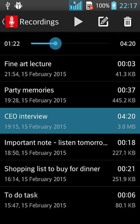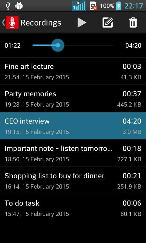 Unduh Voice Recorder untuk mudah, sederhana dan dapat diandalkan audio berkualitas tinggi panjang waktu dan pidato, rekaman suara. Kelas catatan sekolah, kuliah studi universitas, catatan pribadi, buku harian, kenangan, peristiwa yang luar biasa, wawancara wartawan, konferensi bisnis dan pertemuan, pembicaraan tidur malam (atau mendengkur), hari pengasuh Anda, ingat bagaimana Anda menyanyi atau memainkan alat musik, - di situasi Voice Recorder bukti-bukti keandalan dan kredibilitas, tanpa batas waktu. Gunakan kuat Voice Recorder dengan user interface super sederhana dan nyaman di mana-mana yang Anda butuhkan. Download secara gratis!