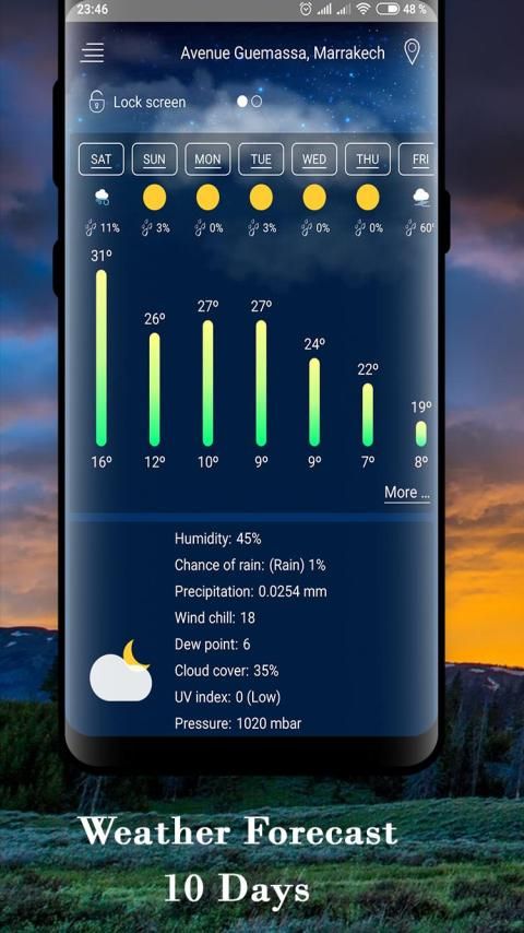 Prakiraan cuaca mendeteksi cuaca di lokasi Anda saat ini secara otomatis. Ada banyak informasi dalam ramalan cuaca yang mencakup kondisi cuaca, tekanan atmosfer, kelembaban relatif, jarak pandang, curah hujan di berbagai tempat, titik embun, kecepatan dan arah angin, selain ramalan cuaca sepuluh hari mendatang, dan ramalan cuaca setiap jam.