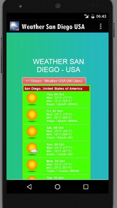 Hal ini menawarkan informasi Weather paling penting di San Diego atau wilayah Anda (suhu saat ini, suhu terendah, kecepatan angin, salju).
