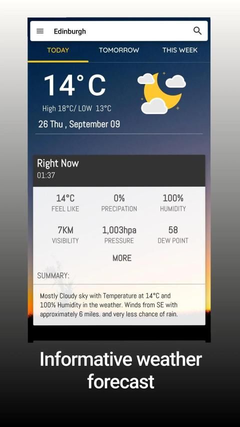 - Full weather report with all-weather information: weather, temperature, atmospheric pressure, weather conditions, visibility distance, relative order, drop in a different unit, dew point, wind speed and direction.