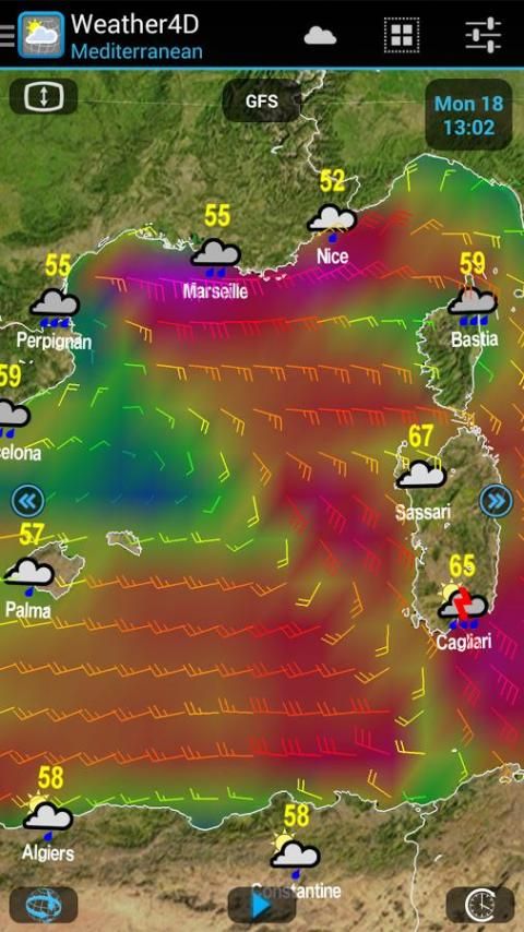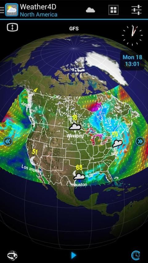 Weather4D adalah aplikasi pertama yang menggunakan kekuatan GPU untuk menghidupkan cuaca seperti video. 2D atau 3D display dilengkapi dengan bergulir terus menerus waktu yang memungkinkan untuk sempurna memvisualisasikan evolusi fenomena cuaca yang akan datang. Bergulir otomatis dapat dipercepat atau diperlambat secara manual dengan maju atau mundur dalam waktu hanya dengan menggeser jari atau dengan penambahan waktu melalui keran di ikon "berikutnya / sebelumnya".