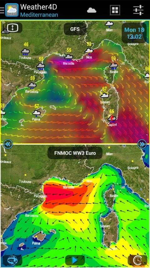 - Data dari Arpège, Arome, WRF, NOAA GFS, NAM, CMC GEM, COAMPS, FNMOC WW3, MyOcean