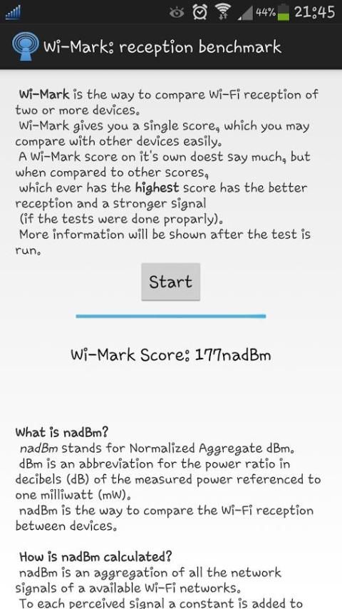 Wi-Mark memberikan skor dalam bentuk nadBm, yang mudah dibandingkan dengan perangkat lain. Yang pernah memiliki nadBm tertinggi di lingkungan yang sama persis memiliki penerimaan yang lebih baik Wi-Fi.