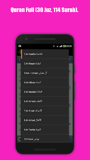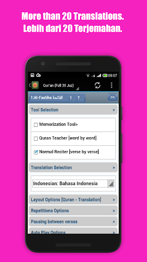 Quran Full (30 Juz, 114 Surah) ini juga dilengkapi terjemahan, terdapat sekitar 20 terjemahan.