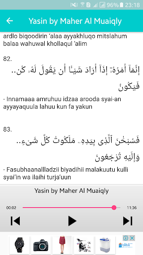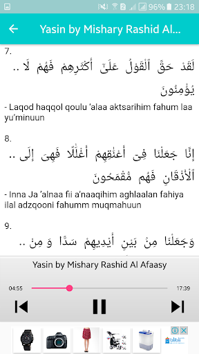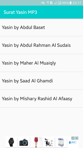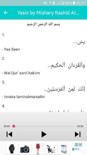 Aplikasi Offline memungkinkan Anda untuk mendengarkan Surah Yasin dari Al-Quran yang indah. Banyak pengacau termasuk. Rekor berikut dapat ditemukan:
