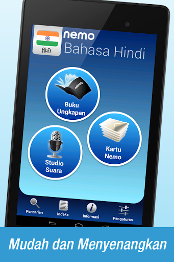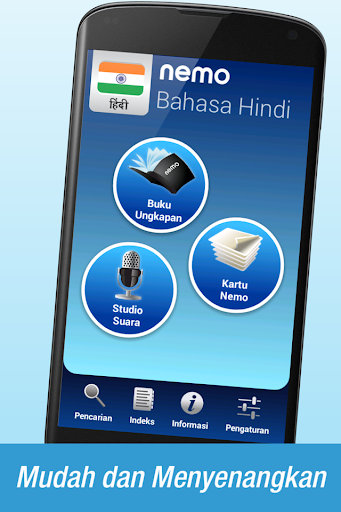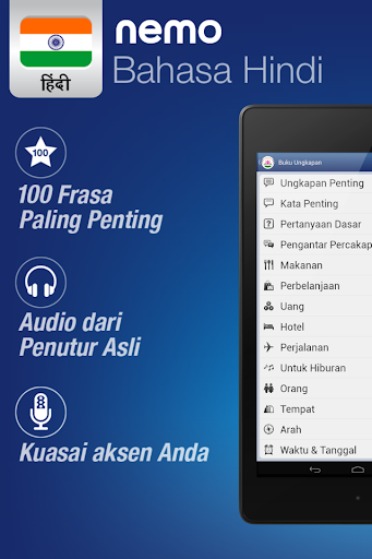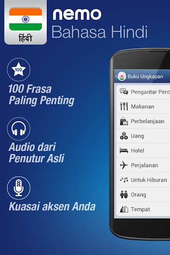 Telusuri apa yang Anda inginkan untuk belajar setiap saat. Buku frasa menawarkan akses cepat ke kosakata dalam aplikasi melalui antarmuka kamus Bahasa Hindi - Bahasa Indonesia. Nemo juga berfungsi sebagai penerjemah. Cukup temukan kata yang Anda inginkan di antarmuka pencarian dan mainkan audio-nya lewat perangkat pengeras suara.