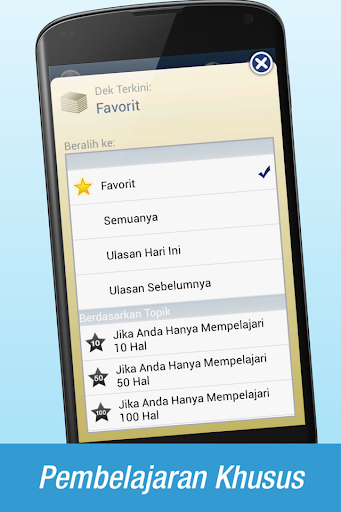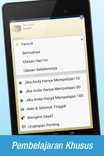 Semua kartu dapat ditandai sebagai favorit, memungkinkan Anda untuk menyusun rangkaian kartu yang memfokuskan sejumlah kata pada hari itu. Aktifkan Mode Ulasan untuk merekap yang Anda pelajari pada permulaan hari agar meningkatkan penyimpanan hafalan Anda.