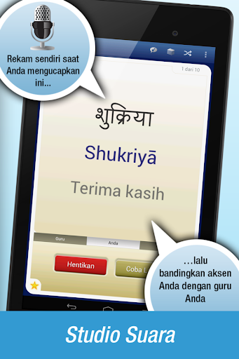 Aplikasi untuk belajar Bahasa Hindi ini tersedia lengkap dalam Bahasa Indonesia dan 10 bahasa lainnya.
