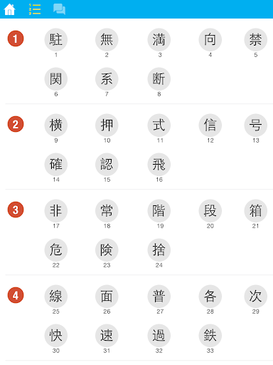 - Kanji dikelompokkan berdasarkan kelas dan JLPT dan dibagi menjadi42 untuk praktik yang mudah.