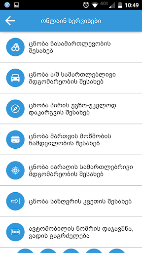 Aplikasi Badan Layanan LEPL MIA ditujukan untuk warga negara Georgia dan bagi mereka yang memiliki izin tinggal. Aplikasi menawarkan untuk mendapatkan layanan dari agen layanan - pemberitahuan pesanan dan membayarnya tanpa mengunjungi kantor agen layanan. Dimungkinkan untuk mendapatkan informasi tentang surat izin mengemudi yang ada, izin senjata dan kendaraan terdaftar. Selain itu pengguna dapat melihat hasil ujian praktek dan teori SIM. Ada kemungkinan untuk mendapatkan tes ujian SIM dan izin senjata dan mempersiapkan diri untuk ujian teoritis atau hanya lulus tes online untuk memeriksa diri sendiri.