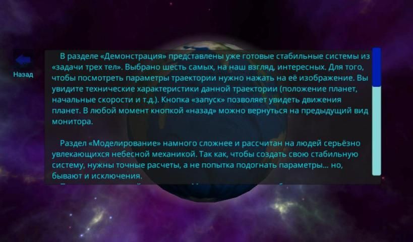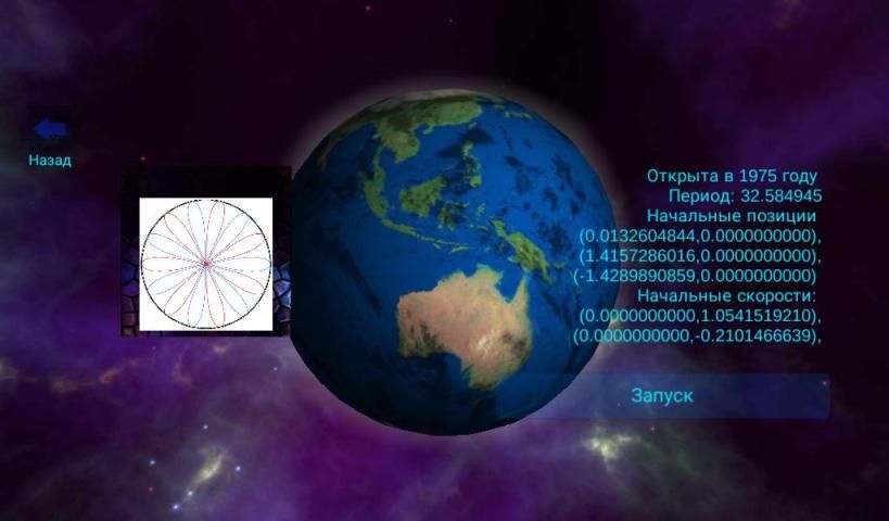Membimbing detail bagian dalam aplikasi (juga) ... Secara singkat - masukkan nomor planet, dan kemudian untuk setiap 7 mengatur parameter (koordinat x, y, z, Velocity x, y, z dan berat badan). Menyimpan data untuk masing-masing planet! Semua memasuki - klik "start".