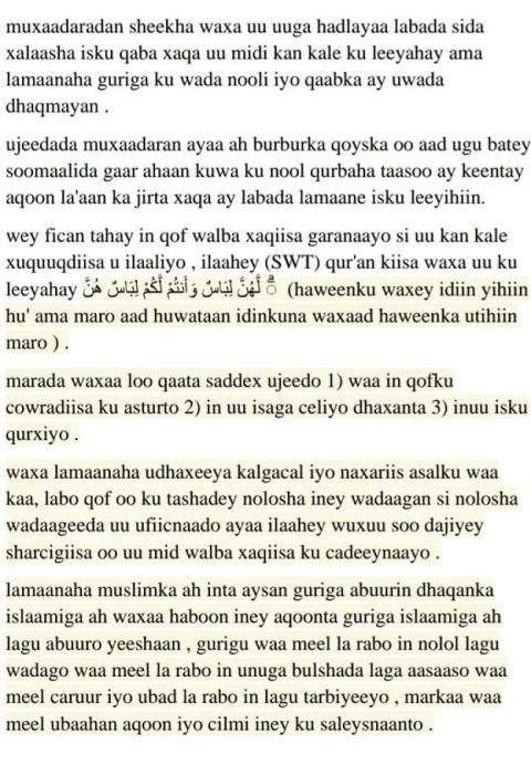 sidaasi darteed ayaan uugu talo galney di ay dadka aqristaan xaquuqaha uu qofba qofka kale ku leeyahay si loo badbaadiyo qoysaskeena, waana muxaadaro laga qorey Sheekh mustafa xaaji ismaaciil haaruun.
