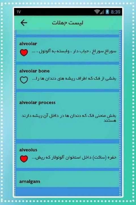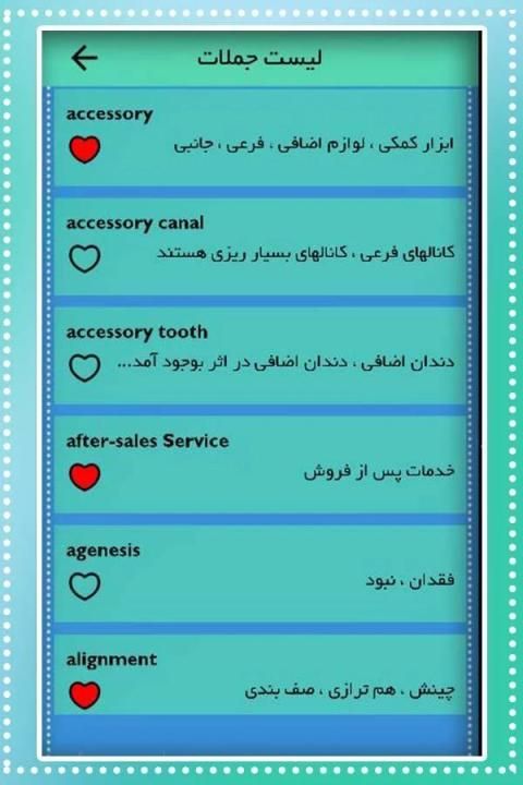 شما میتوانید اصطلاحات دندانپزشکی را به راحتی با این برنامه یاد بگیرید و با استفاده از ویجت برنامه هر روز اصطلاحات رشته دندان پزشکی را مرور کرده تا در ذهنتان حک شود، هم چنین میتوانید اصطلاحات مورد علاقه و پرکاربرد را نیز جز دسته علاقه مندی های خود قرار دهید و یا حتی اصطلاحاتی که مایلید بیشتر برای حفظ و یادگیری آن ها وقت صرف کنید.