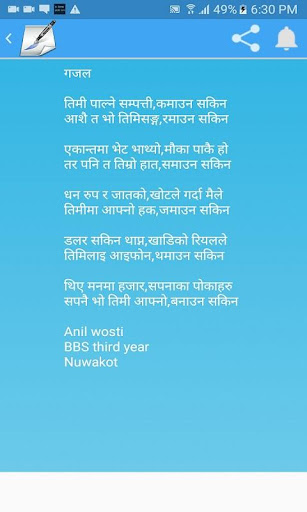 Nepal Gajal mempromosikan aplikasi Gajal.Kami ingin mempromosikan Nepal Gajal di seluruh dunia.Untuk mencapai tujuan ini, kami membutuhkan dukungan Anda.Anda dapat mengirim Gajal Anda, berbagi dengan teman dan menilai kami.Berharap bahwa kami akan sukses dalam misi Gajal kami.