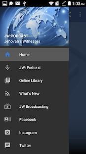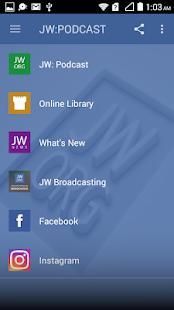JW: Podcast - Online Library - What's New - JW Broadcasting - Facebook - Instagram - Twitter