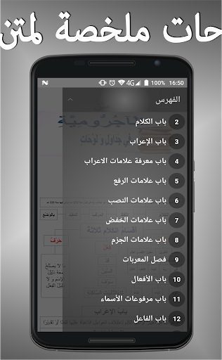 • بعد فتح تطبيق جداول ولوحات الآجرومية يمكن الابحار في أبواب تطبيق جداول ولوحات الآجرومية اما بجر قائمة من اليمين، لتظهر لك قائمة تصفح الأبواب الخاصة بتطبيق جداول ولوحات الآجرومية .