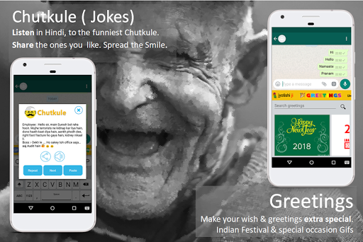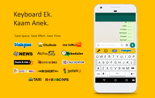 Filmi Dialogue Stickers, Book a Taxi / Autorickshaw, hear Hindi Jokes, Horoscope, News, Live Cricket Score, Message Scheduler, Live Traffic, Jyotishi ji, Calculator, Torch, Hindi & English keys, Deals, InShort replies & more on a Scrollable Topbar™ in your RamuKaka SuperApp Multipurpose keyboard.